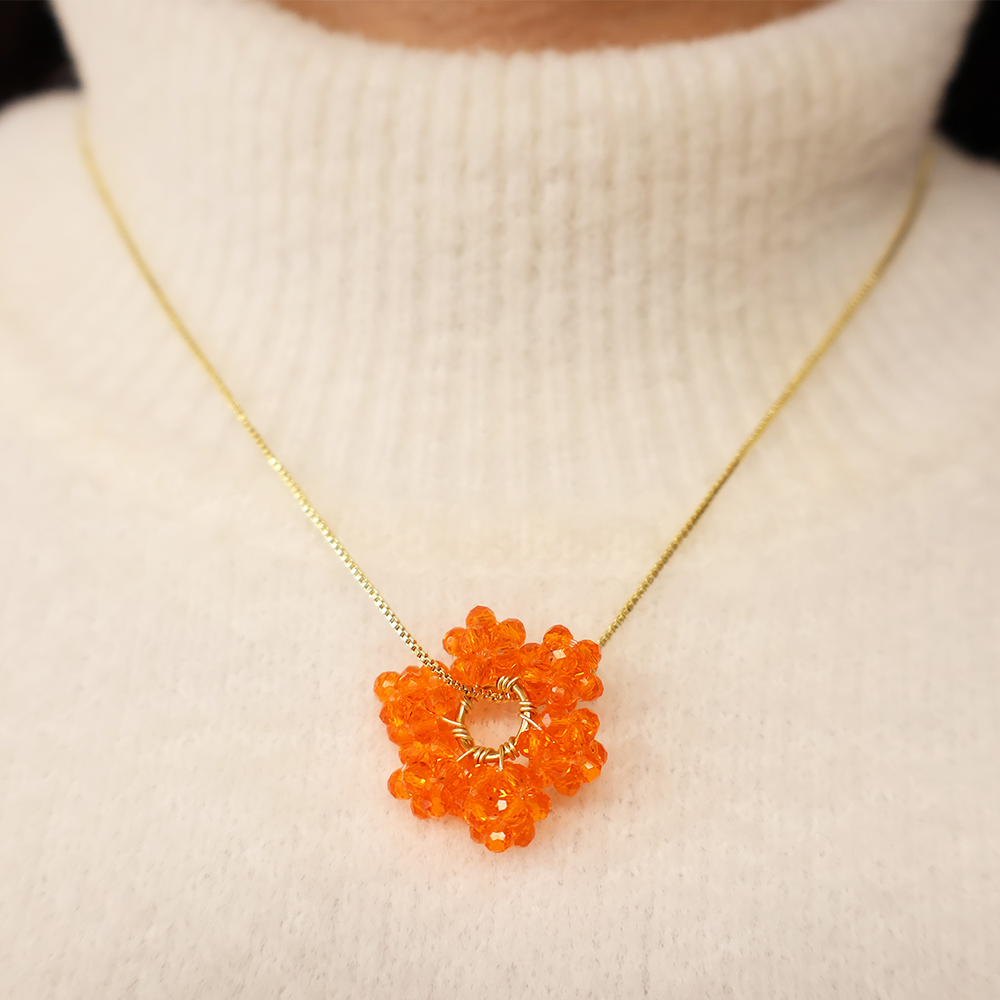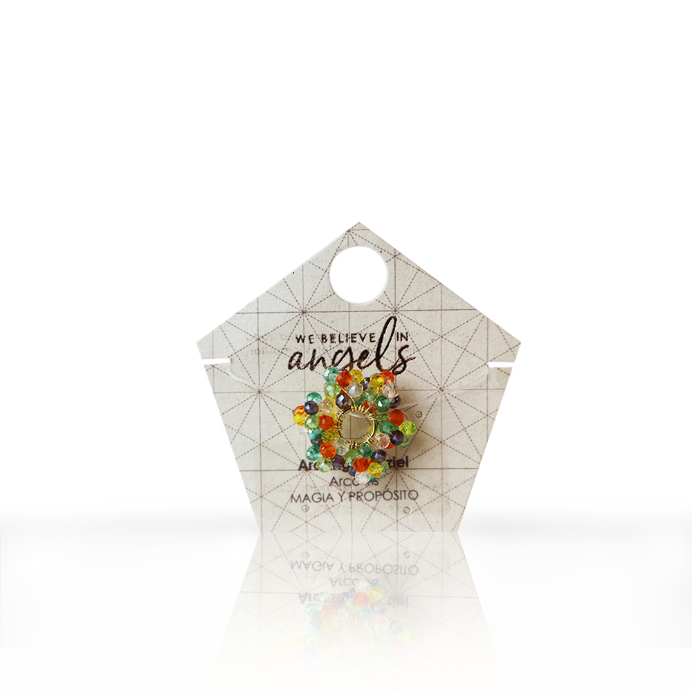 Dije intercambiable. En forma de ruedita, compuesto por seis hexaedros elaborados a mano en rondelas de cristal. Ideal para llevar en tu cadena, permitiéndote elegirlo según el propósito, intención o estado de ánimo.