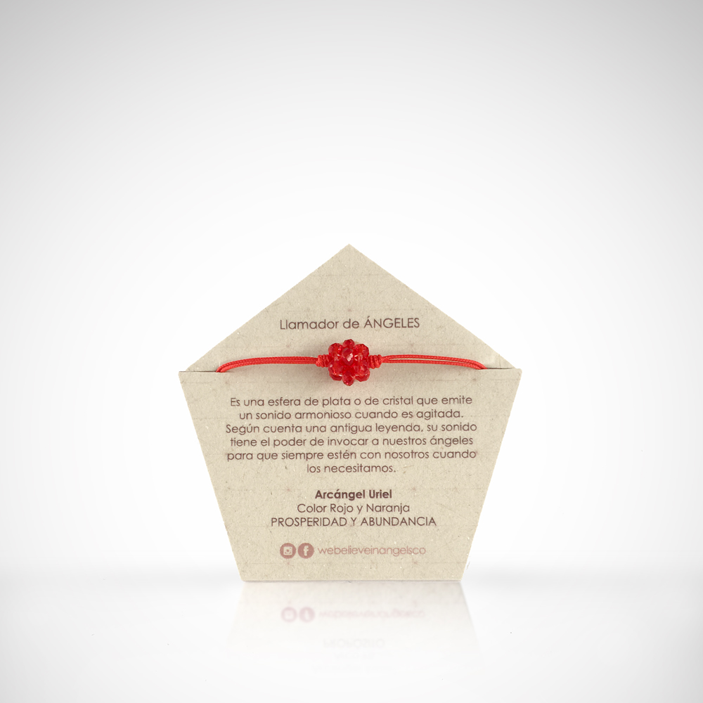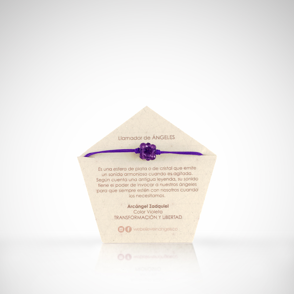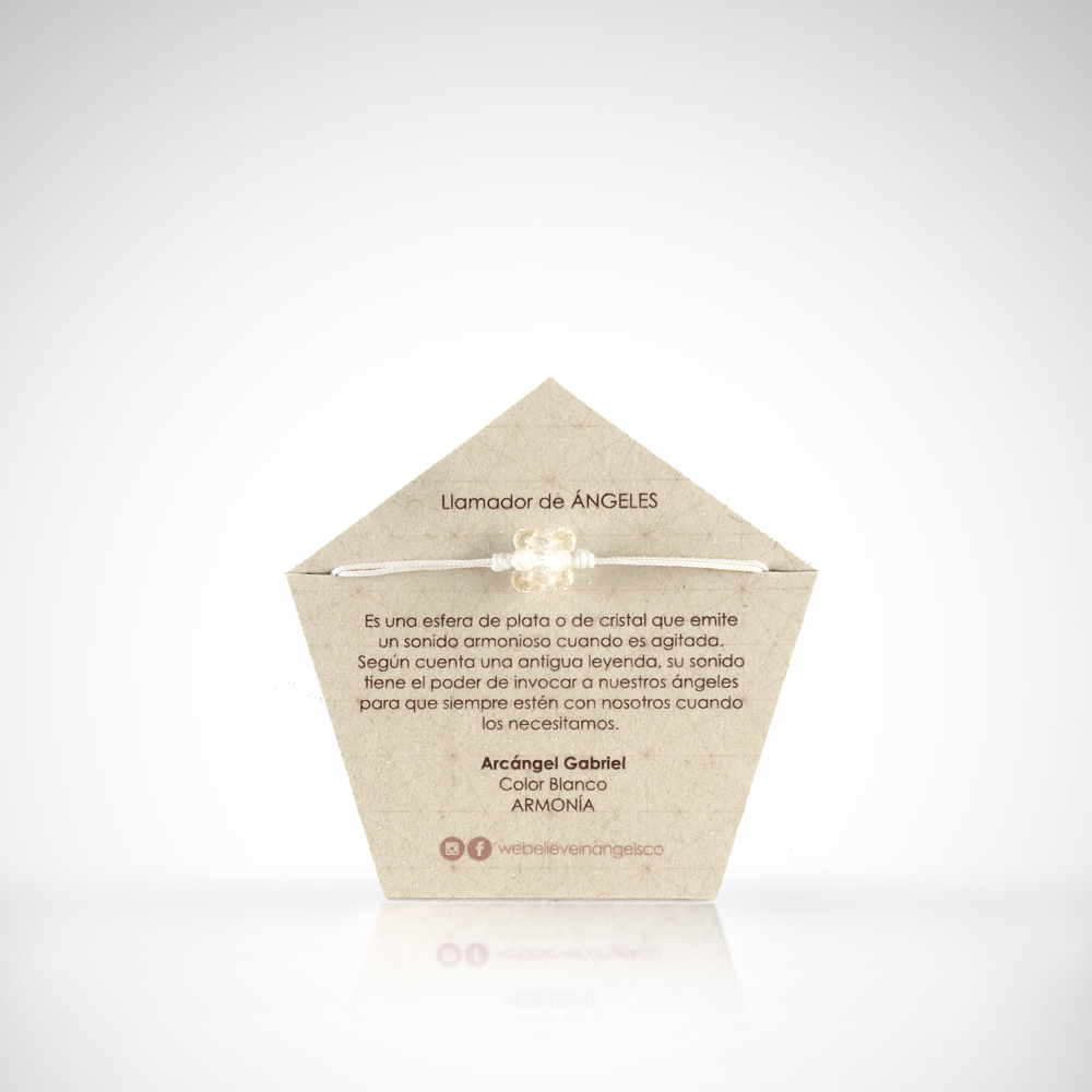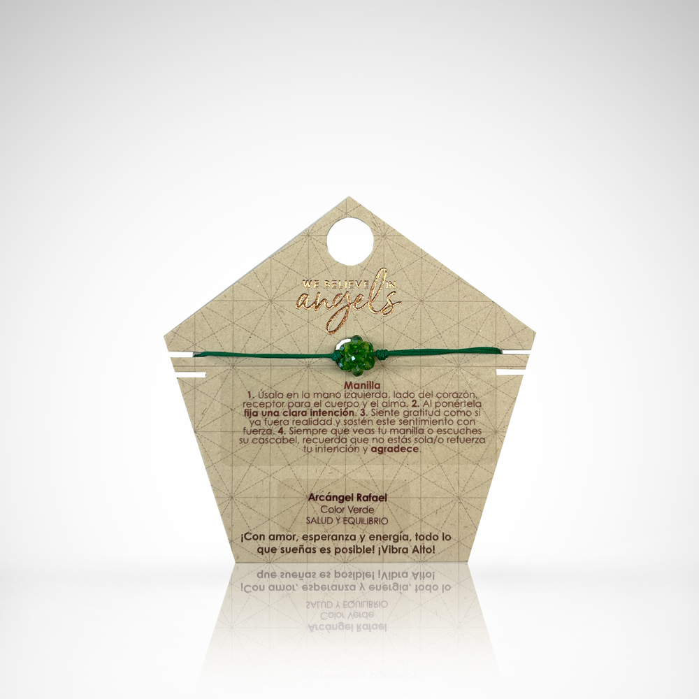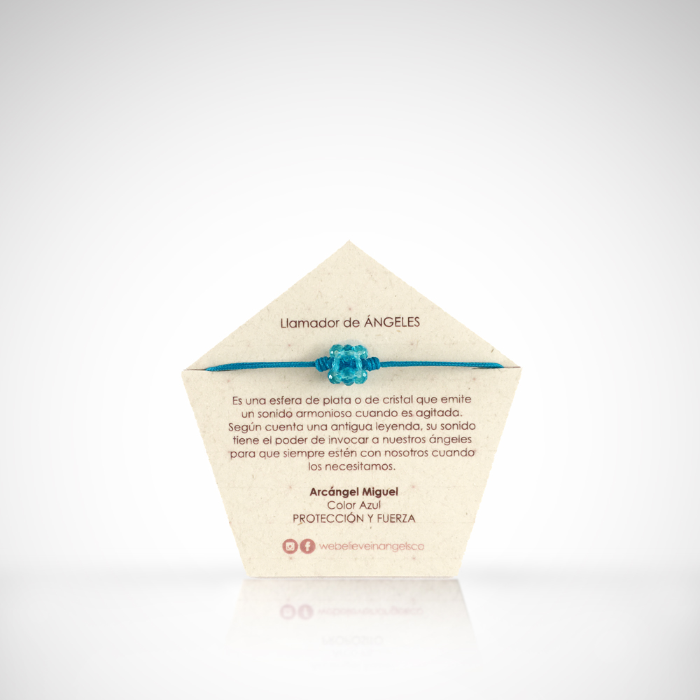 Manilla con hexaedro tejido a mano en rondelas de cristal y llamador de ángeles de acero. La manilla es en hilo y es ajustable a varios tamaños.