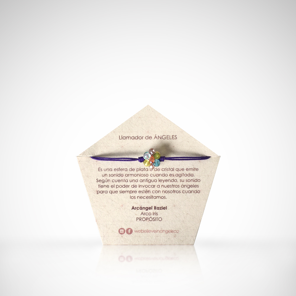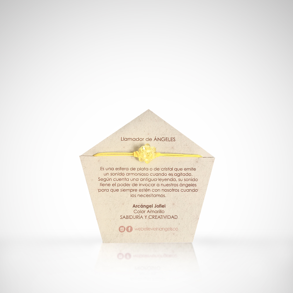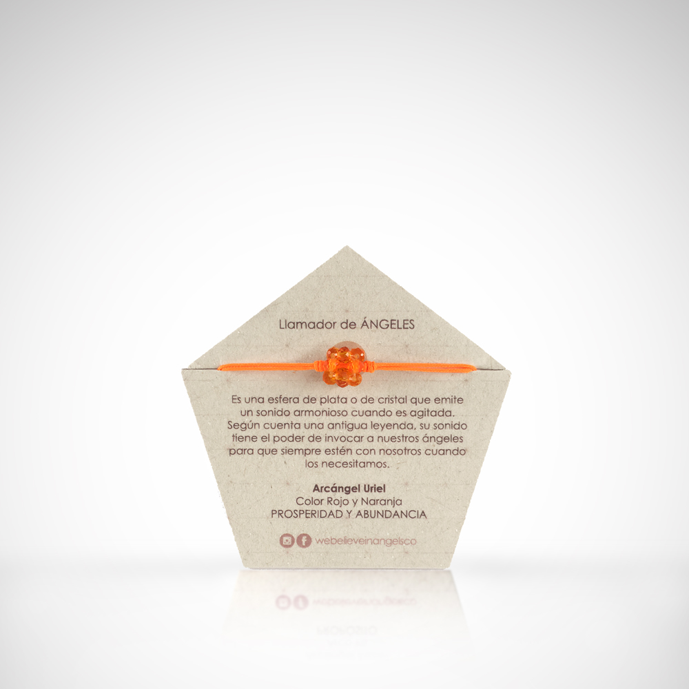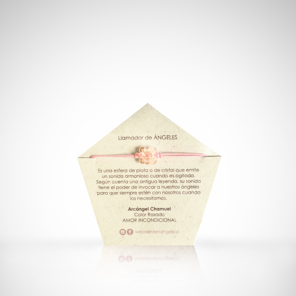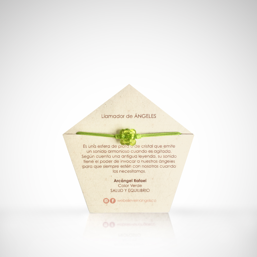 Manilla con hexaedro tejido a mano en rondelas de cristal y llamador de ángeles de acero. La manilla es en hilo y es ajustable a varios tamaños.